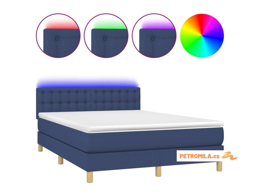 Box spring postel s matrací a LED modrá 140x200 cm textil