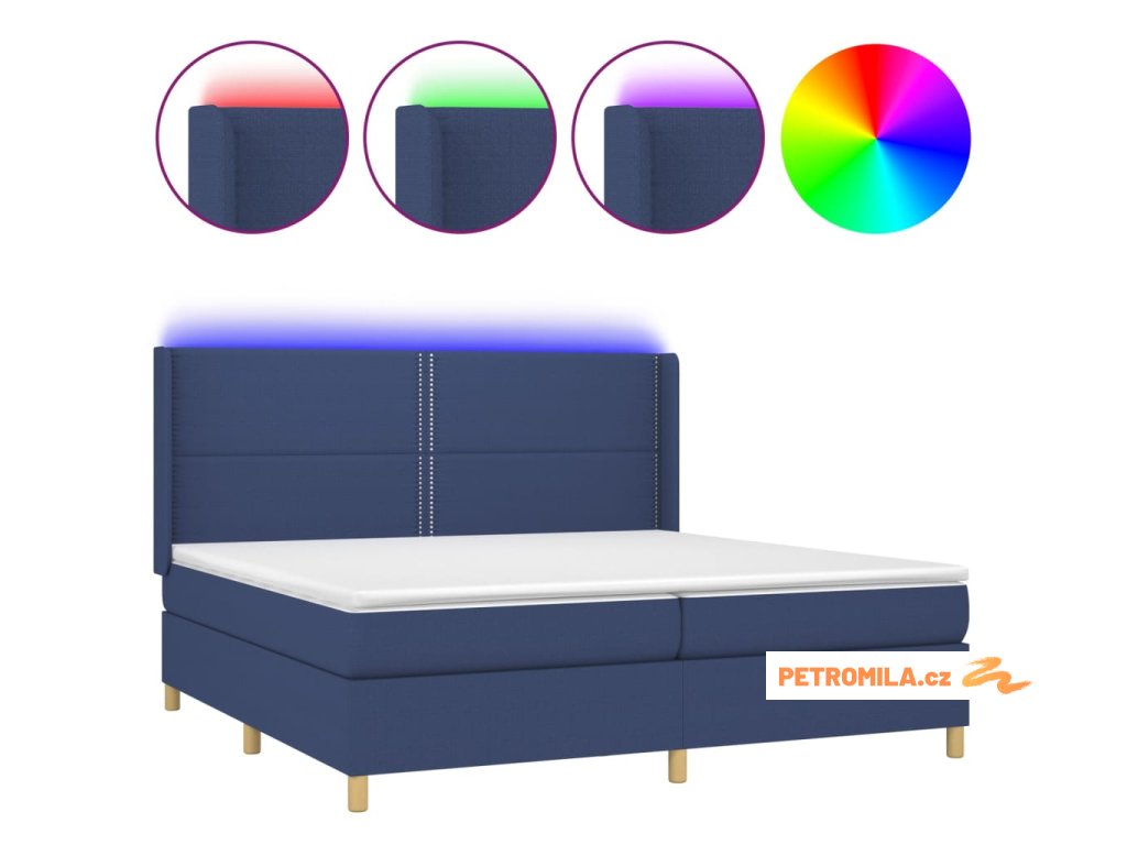 Box spring postel s matrací a LED modrá 200x200 cm textil