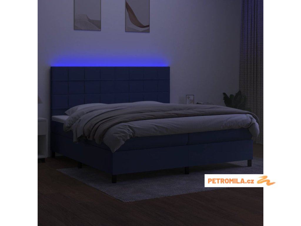 Box spring postel s matrací a LED modrá 200x200 cm textil