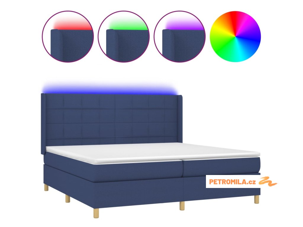 Box spring postel s matrací a LED modrá 200x200 cm textil