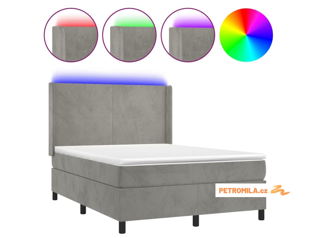 Box spring postel s matrací a LED světle šedá 140x190 cm samet