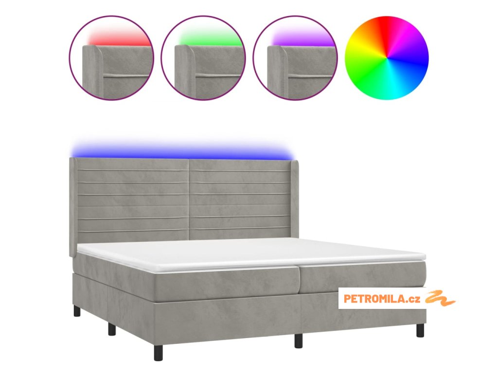Box spring postel s matrací a LED světle šedá 200x200 cm samet