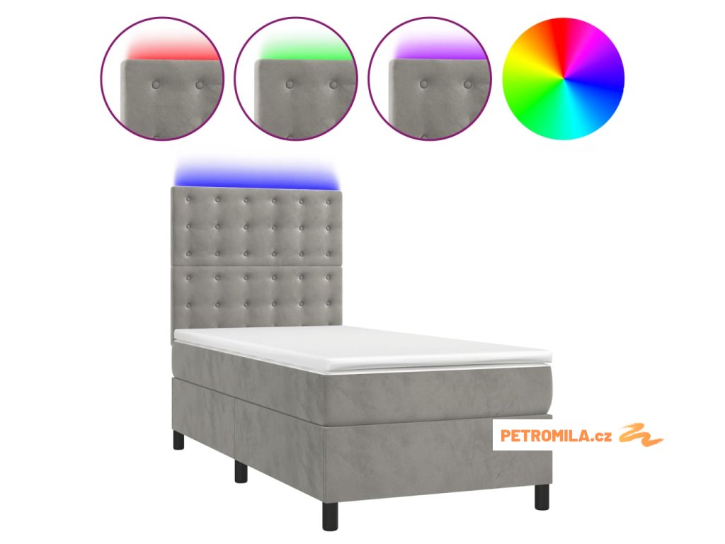 Box spring postel s matrací a LED světle šedá 90x190 cm samet
