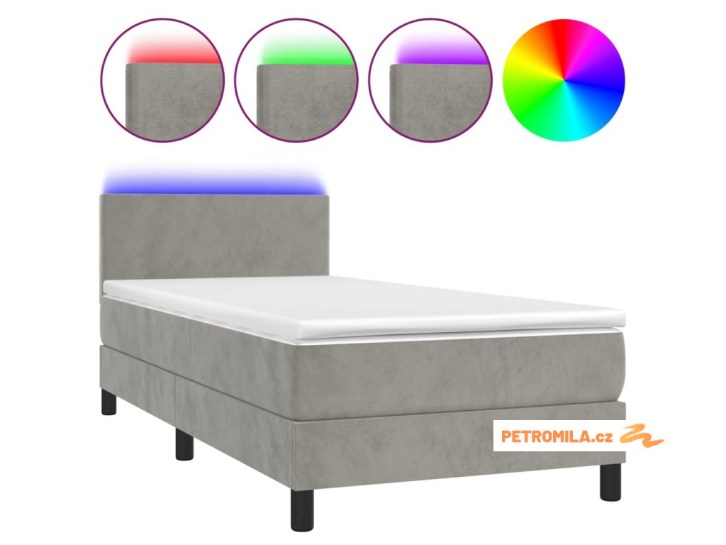 Box spring postel s matrací a LED světle šedá 90x190 cm samet