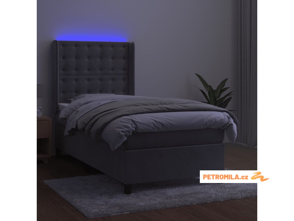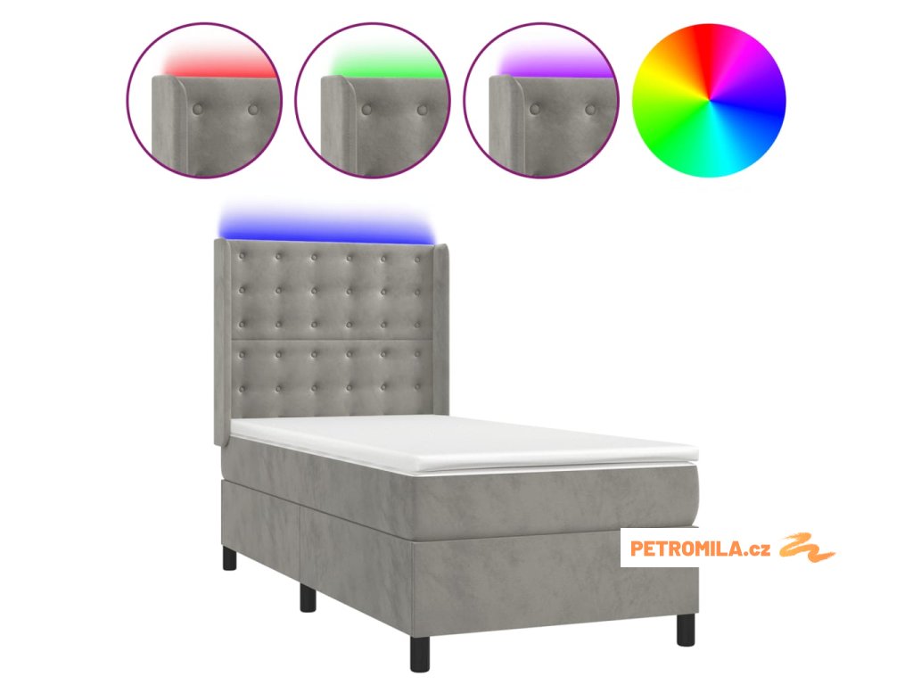 Box spring postel s matrací a LED světle šedá 90x200 cm samet