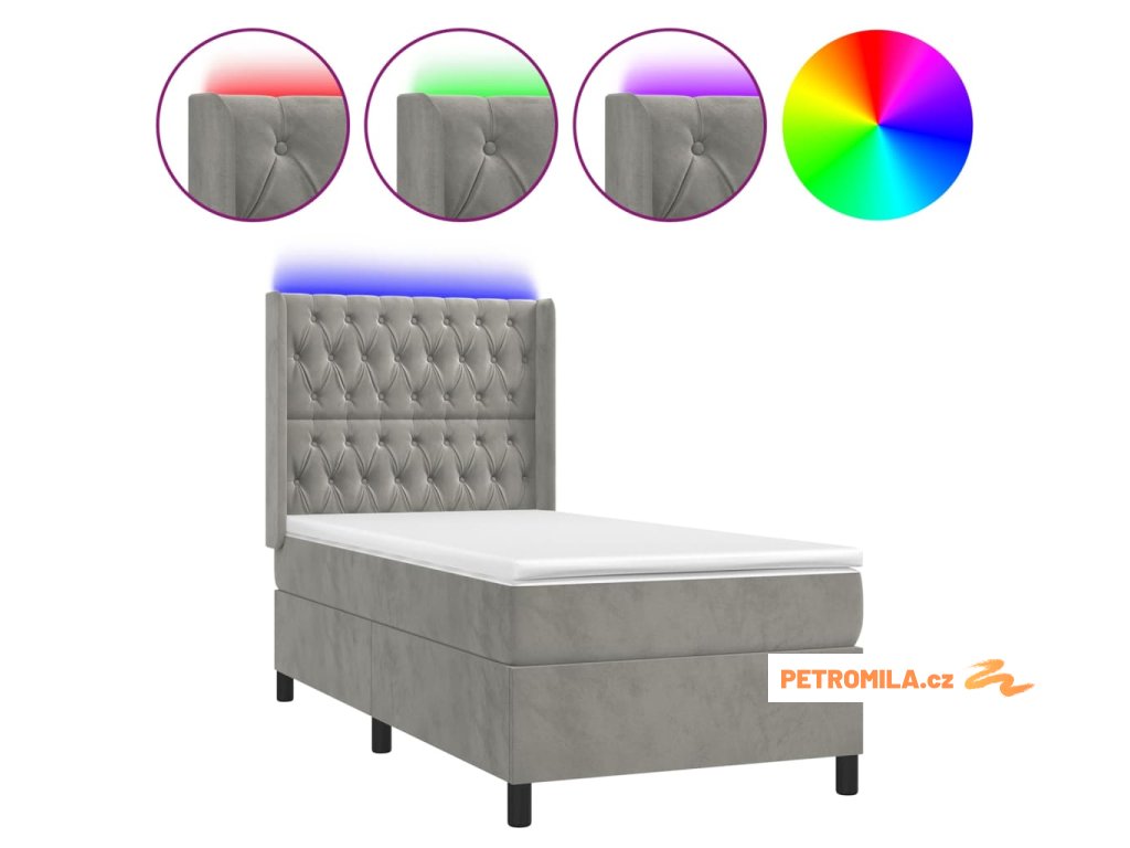 Box spring postel s matrací a LED světle šedá 90x200 cm samet