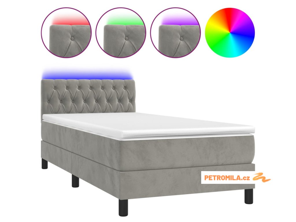 Box spring postel s matrací a LED světle šedá 90x200 cm samet