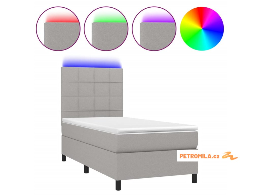 Box spring postel s matrací a LED světle šedá 90x200 cm textil