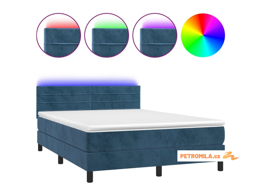 Box spring postel s matrací a LED tmavě modrá 140x190 cm samet