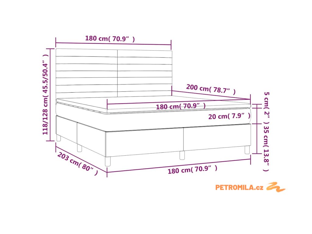 - Celkové rozměry: 203 x 180 x 118/128 cm (D x Š x V)