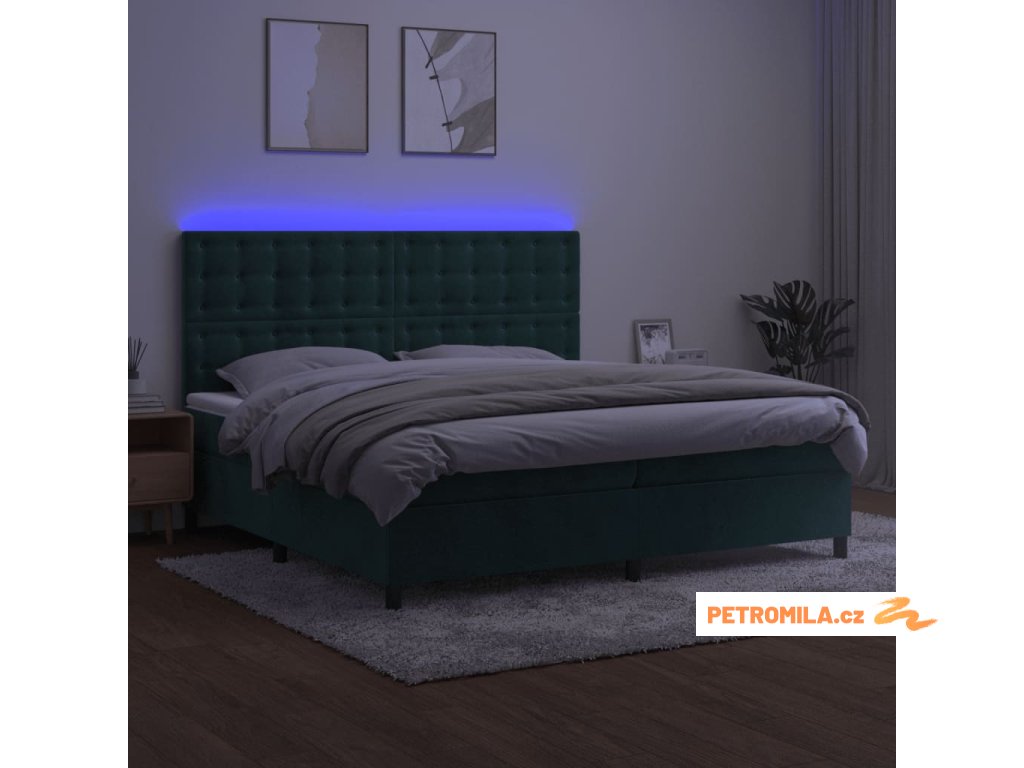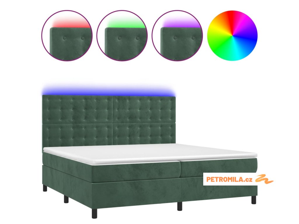 Box spring postel s matrací a LED tmavě zelená 200x200 cm samet