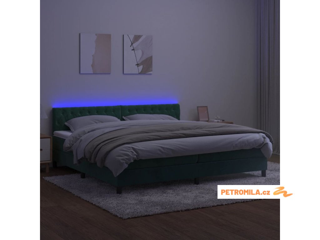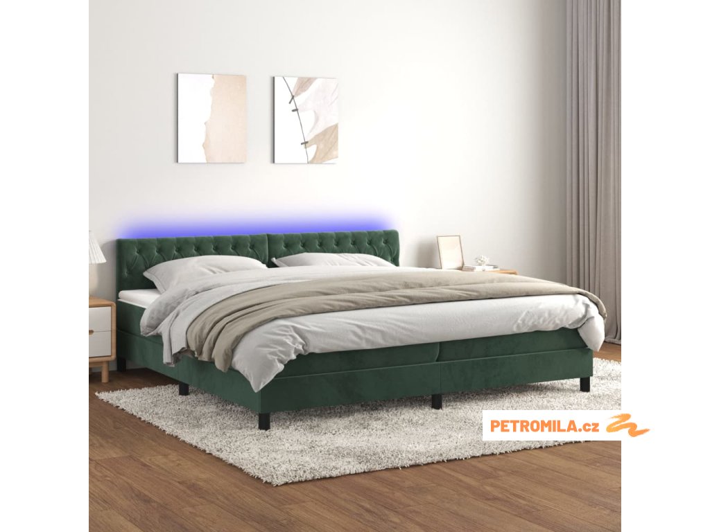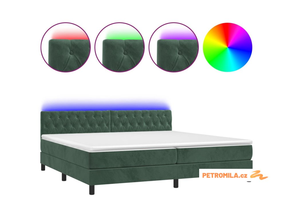 Box spring postel s matrací a LED tmavě zelená 200x200 cm samet