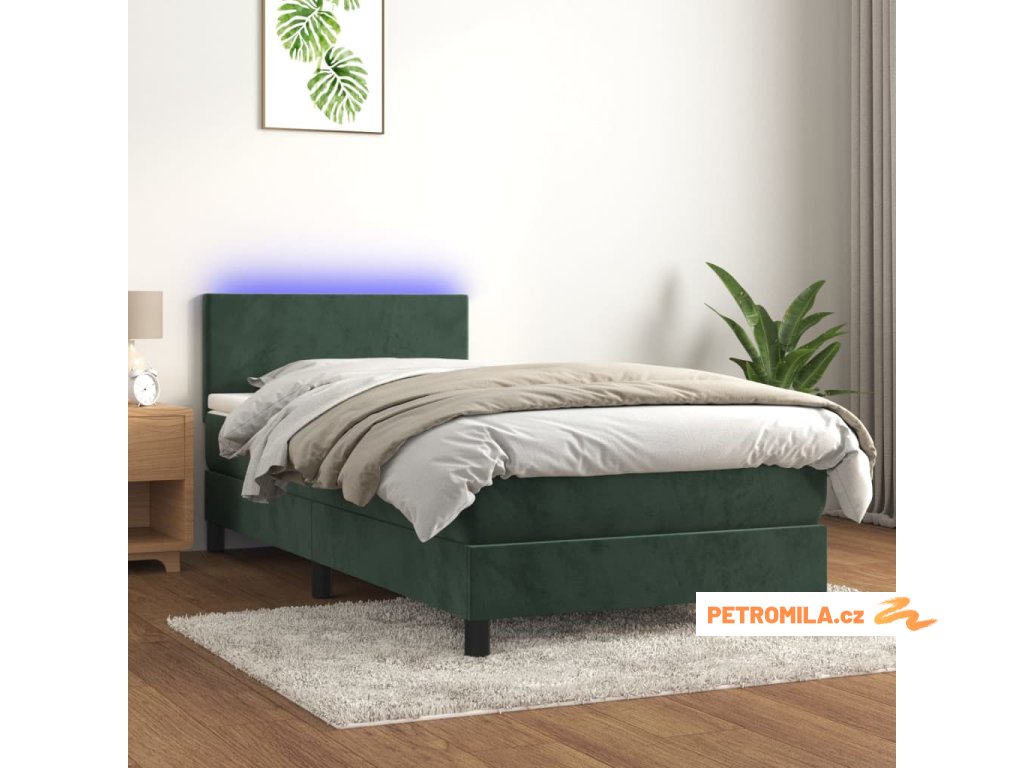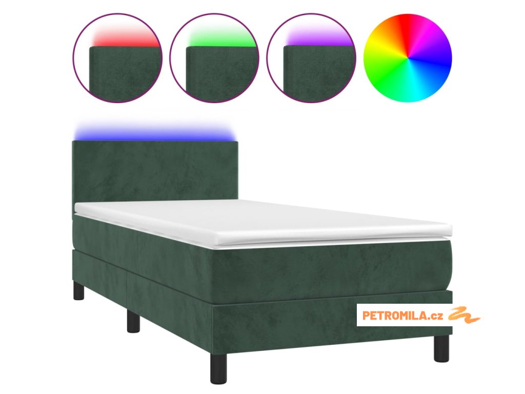 Box spring postel s matrací a LED tmavě zelená 90x190 cm samet