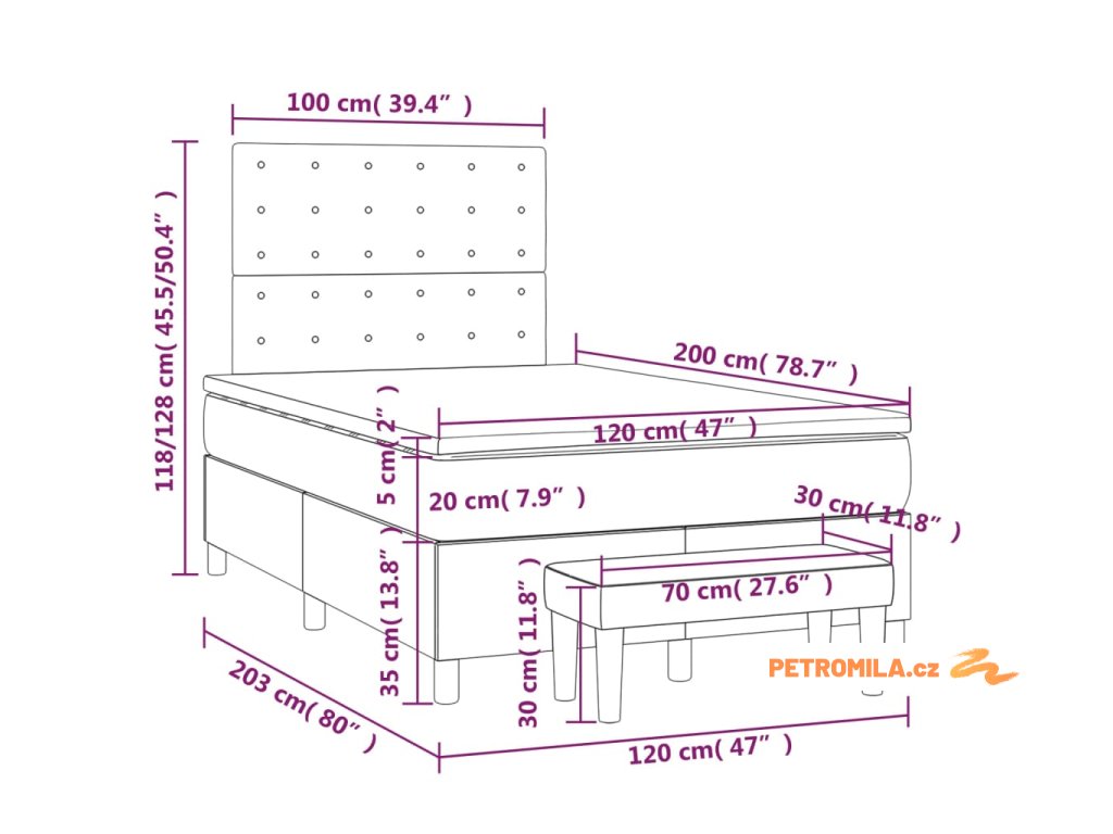 - Rozměry: 203 x 120 x 118/128 cm (D x Š x V)