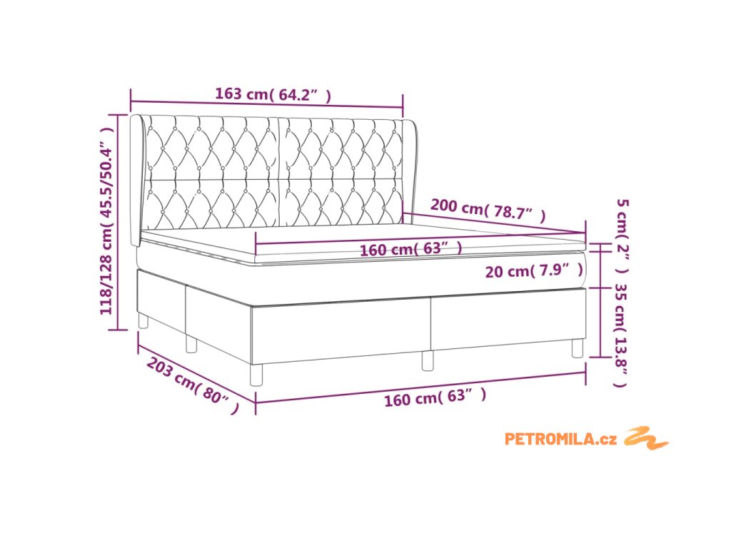 - Rozměry: 203 x 163 x 118/128 cm (D x Š x V)