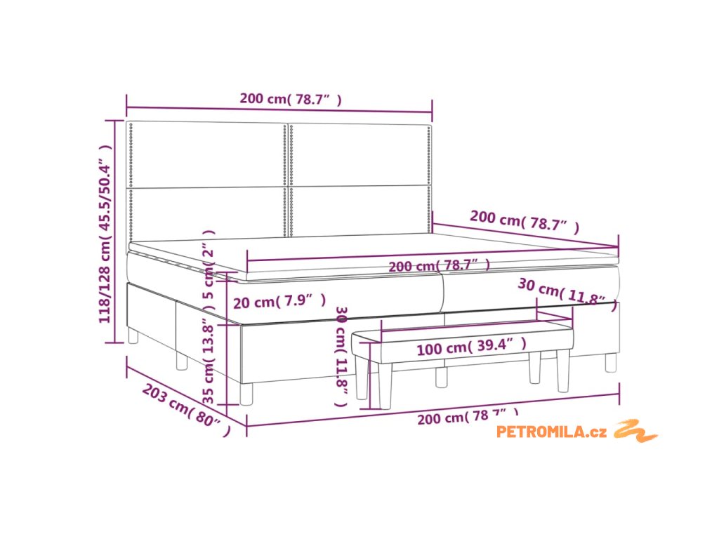 - Rozměry: 203 x 200 x 118/128 cm (D x Š x V)