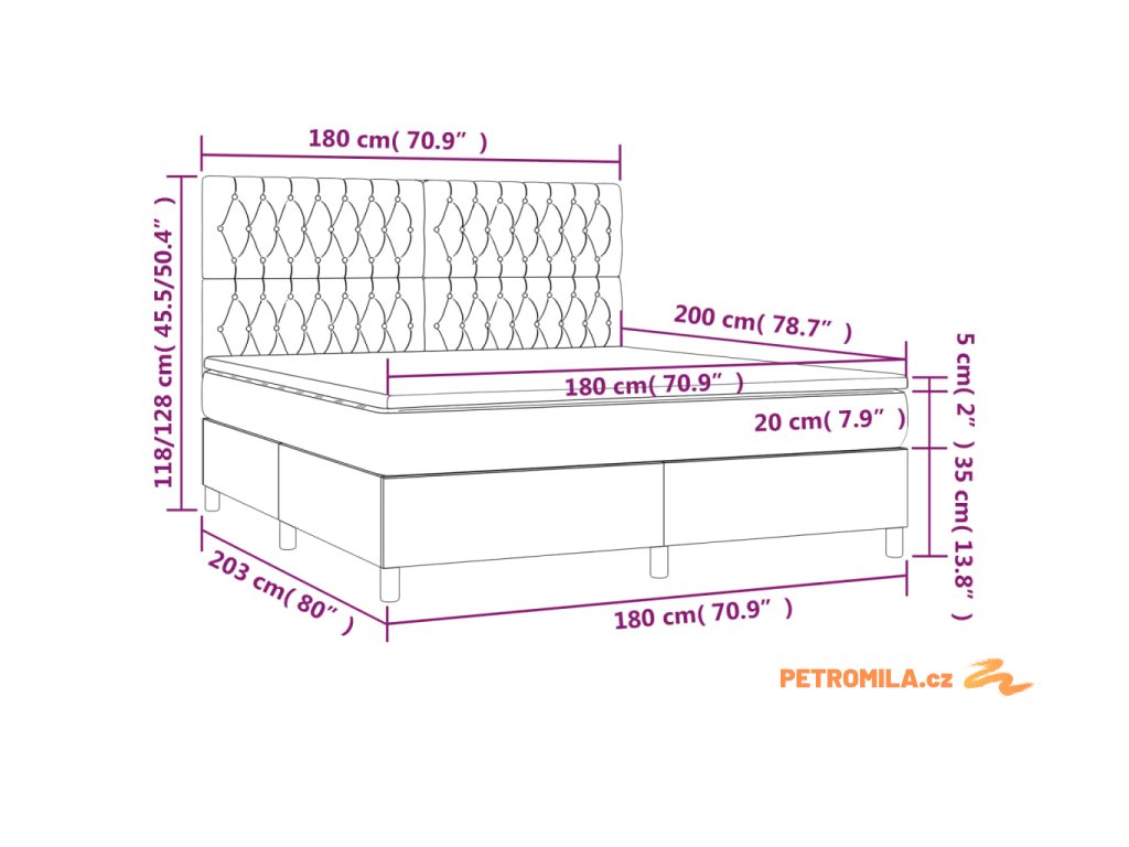 - Rozměry: 203 x 180 x 118/128 cm (D x Š x V)