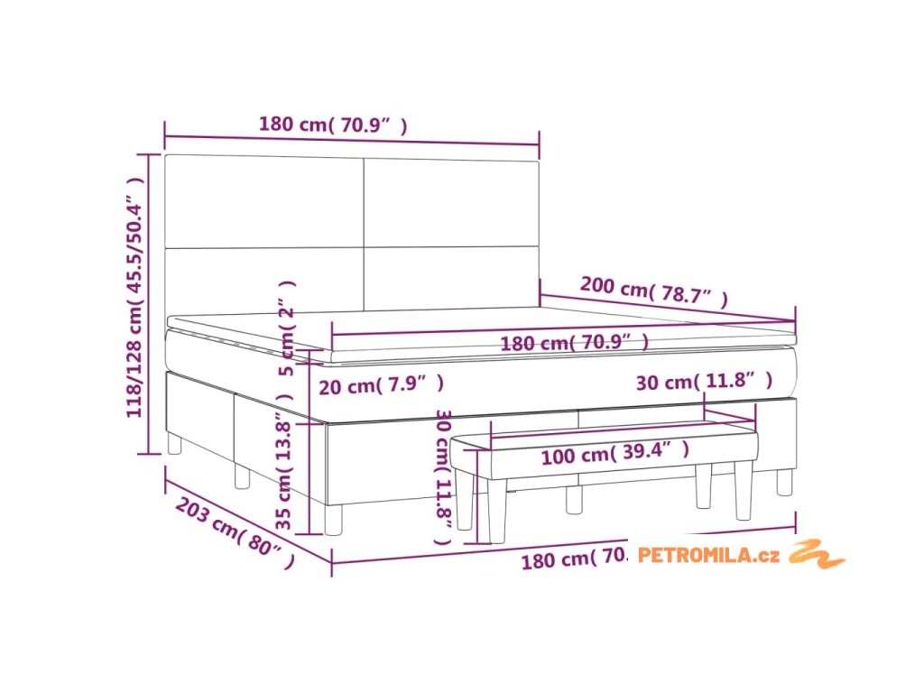 - Rozměry: 203 x 180 x 118/128 cm (D x Š x V)