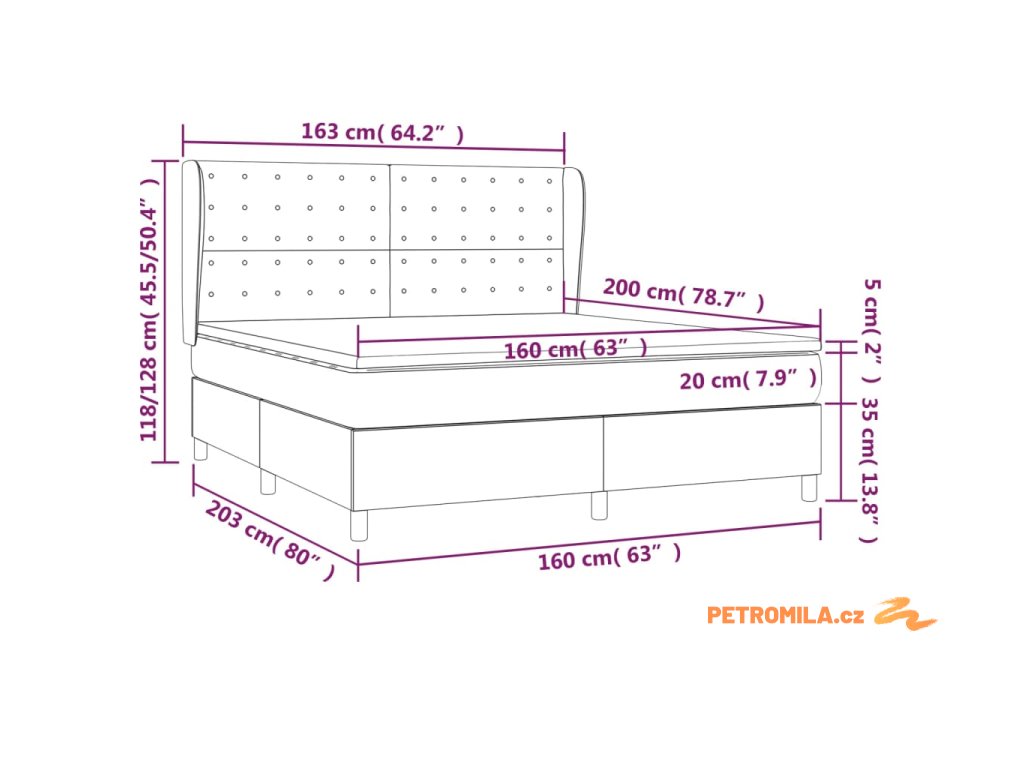 - Rozměry: 203 x 163 x 118/128 cm (D x Š x V)