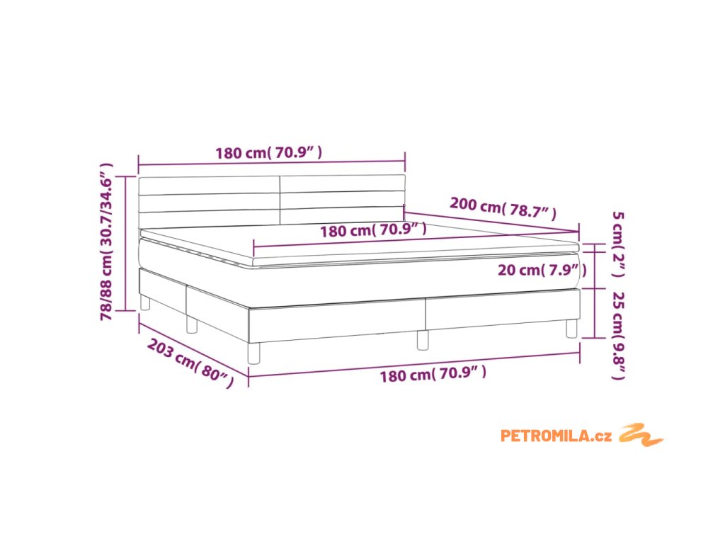- Rozměry: 203 x 180 x 78/88 cm (D x Š x V)