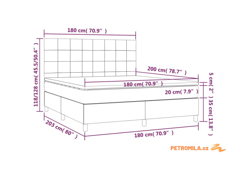 - Rozměry: 203 x 180 x 118/128 cm (D x Š x V)