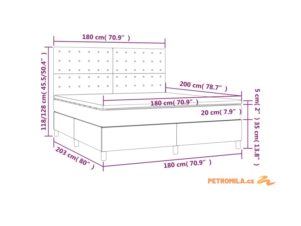 - Rozměry: 203 x 180 x 118/128 cm (D x Š x V)