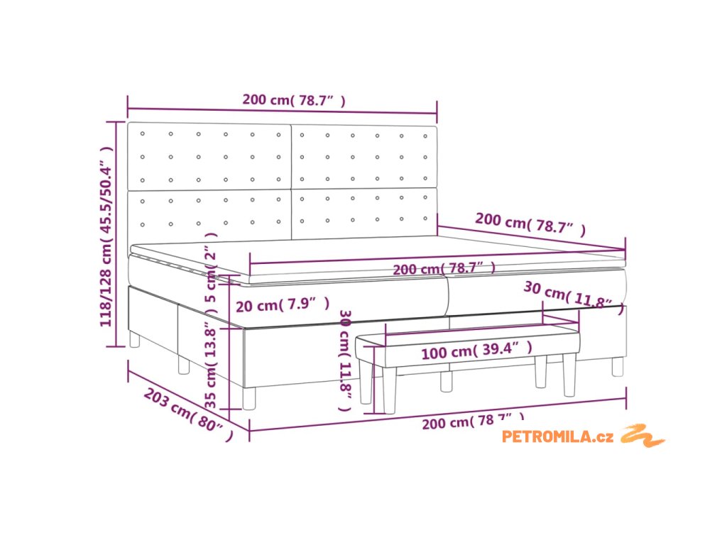 - Rozměry: 203 x 200 x 118/128 cm (D x Š x V)