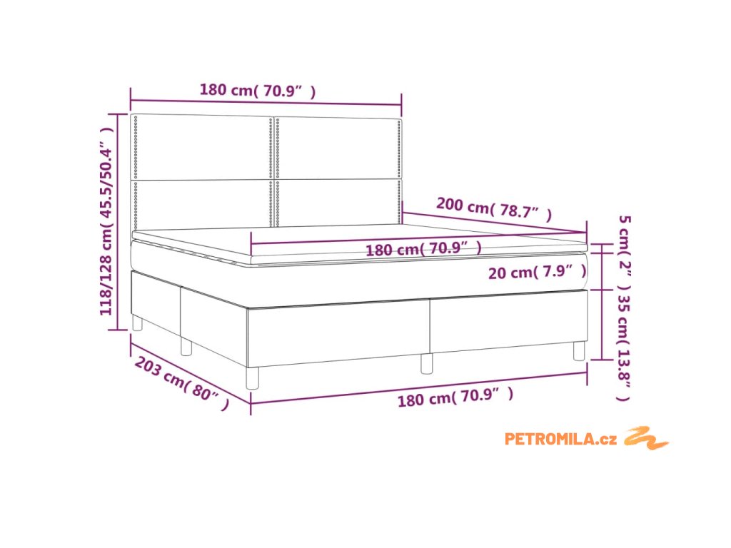 - Rozměry: 203 x 180 x 118/128 cm (D x Š x V)