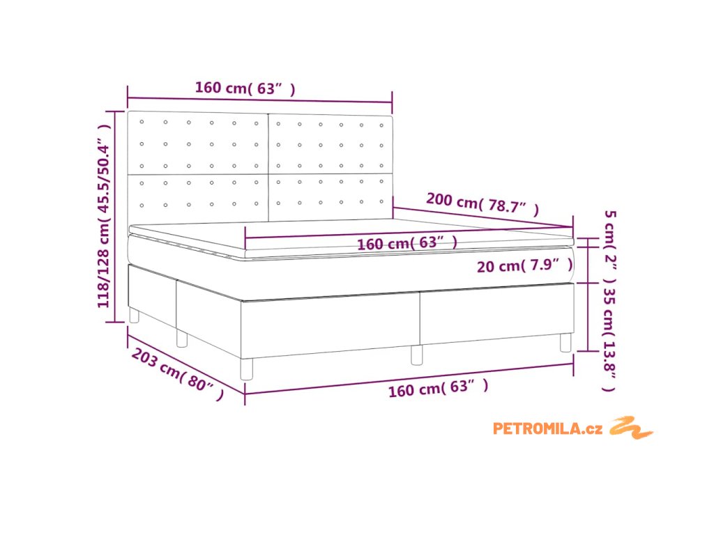 - Rozměry: 203 x 160 x 118/128 cm (D x Š x V)