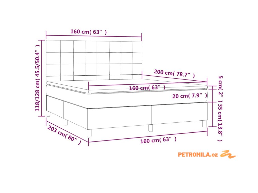 - Rozměry: 203 x 160 x 118/128 cm (D x Š x V)