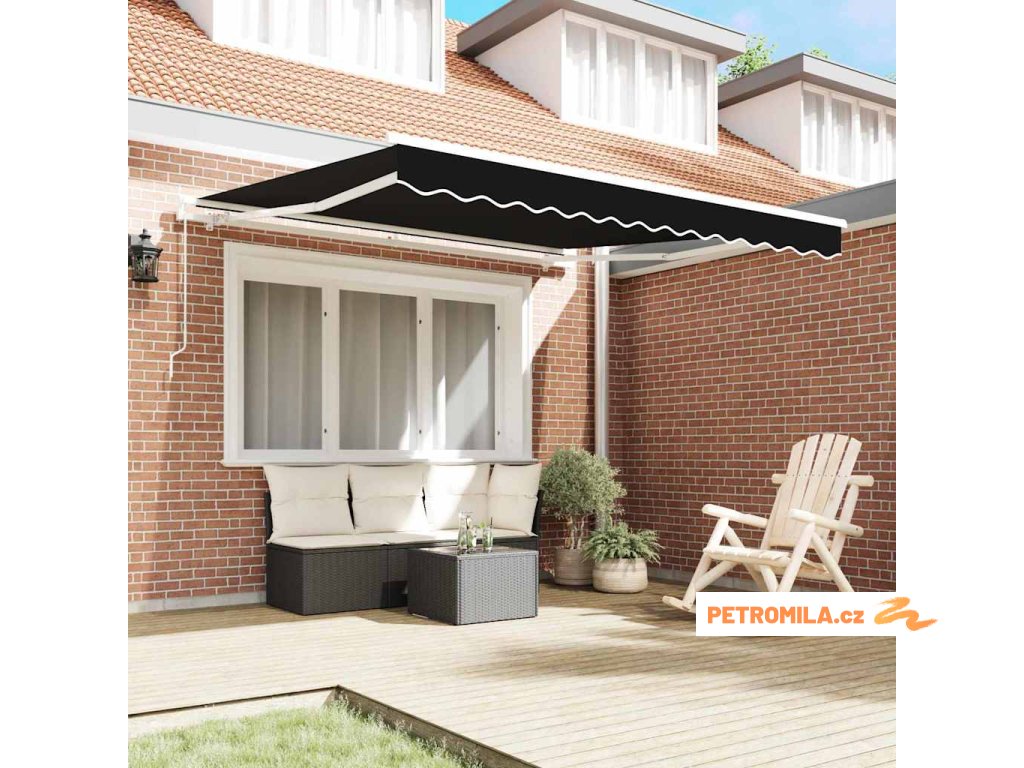 Toto je výsuvná markýza, ideální pro balkony a zahrady. Elegantní černá s bílými detaily dává tvořím venkovním prostorům styl a užitečnost. Vyrobená z kvalitních materiálů, dodává pěknou atmosféru a je spolehlivá. Zlepší tvůj venkovní život s touhle šikovnou markýzou, která je skvělá na setkání s přáteli nebo jen odpočinek.