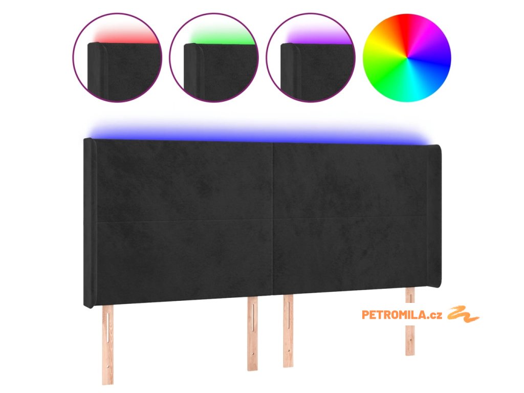 Čelo postele s LED černé 203 x 16 x 118/128 cm samet