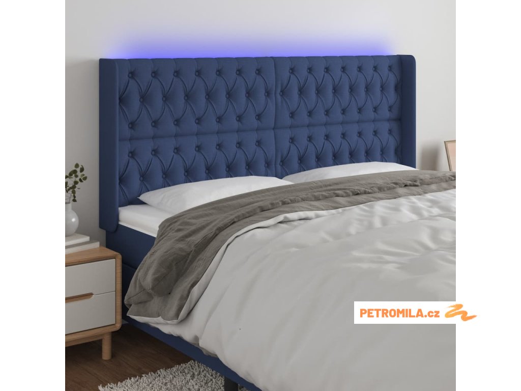 Čelo postele s LED modré 203 x 16 x 118/128 cm textil