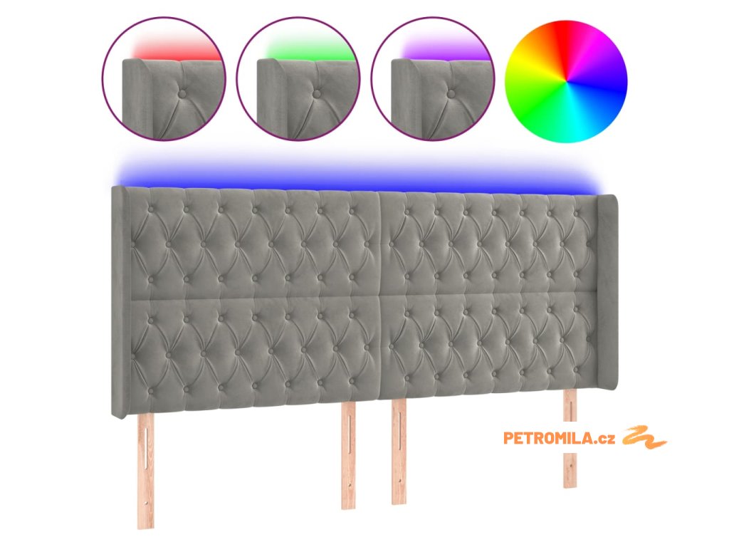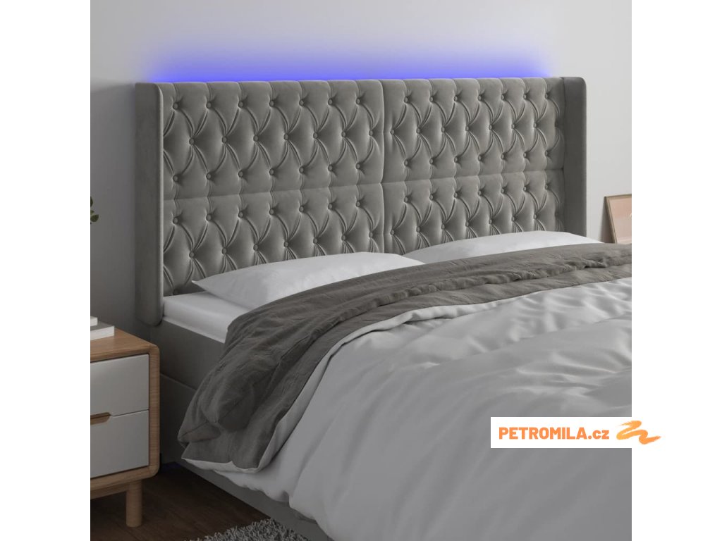 Čelo postele s LED světle šedé 183 x 16 x 118/128 cm samet