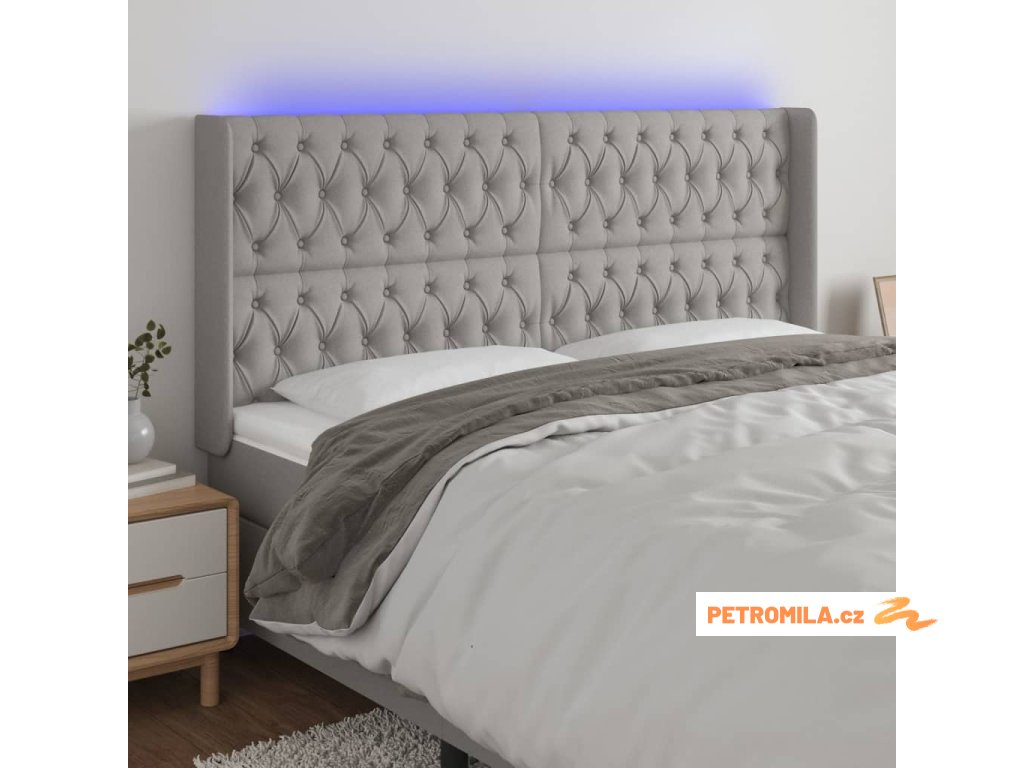 Čelo postele s LED světle šedé 183x16x118/128 cm textil