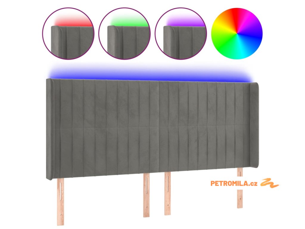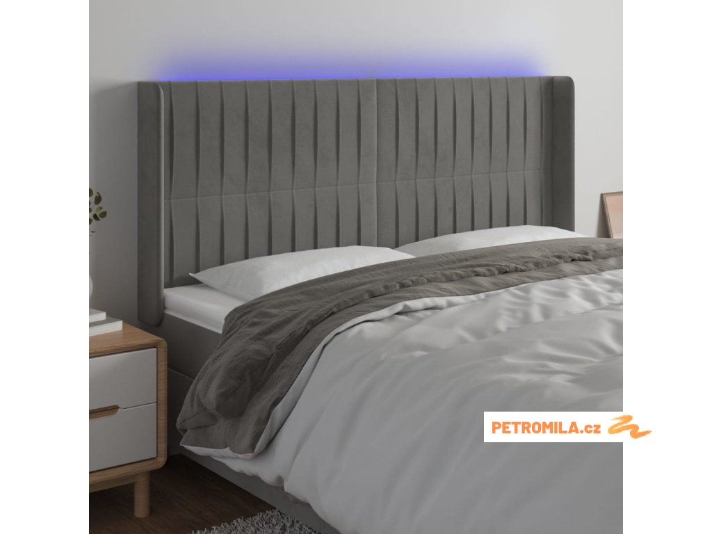 Čelo postele s LED světle šedé 203 x 16 x 118/128 cm samet