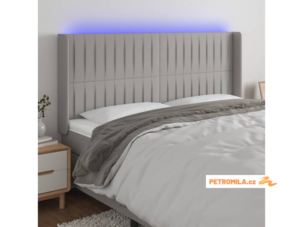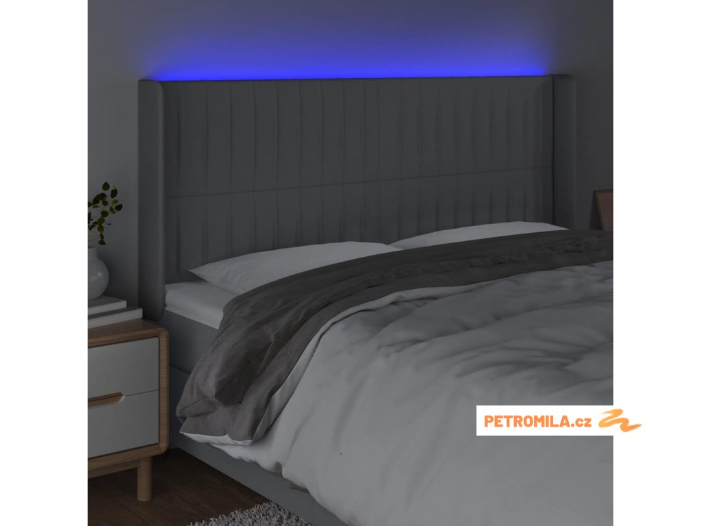 Čelo postele s LED světle šedé 203x16x118/128 cm textil