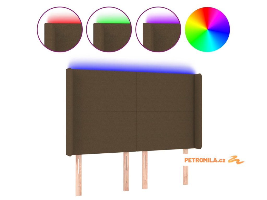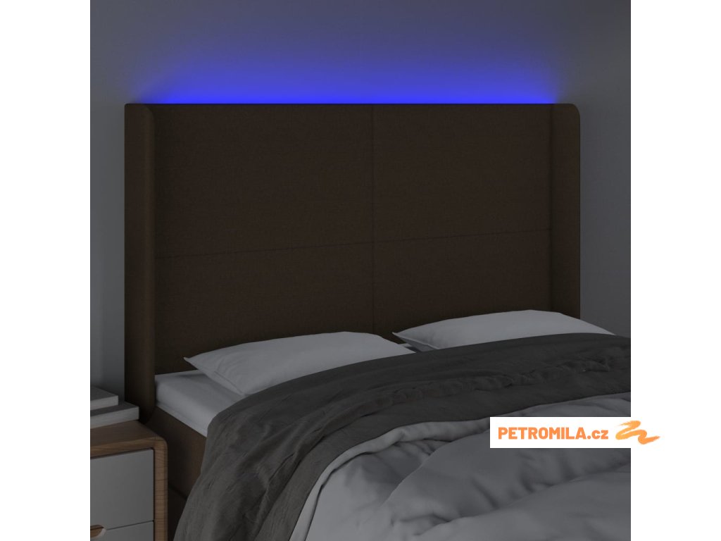 Čelo postele s LED tmavě hnědé 147 x 16 x 118/128 cm textil