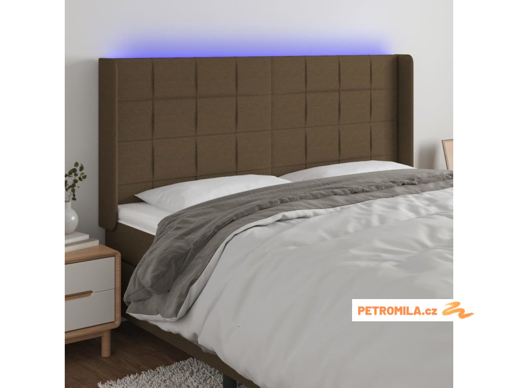 Čelo postele s LED tmavě hnědé 183 x 16 x 118/128 cm textil