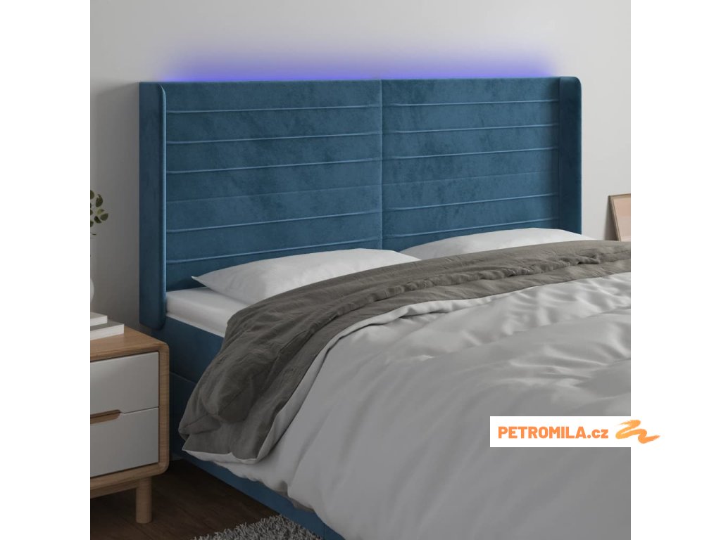 Čelo postele s LED tmavě modré 163 x 16 x 118/128 cm samet