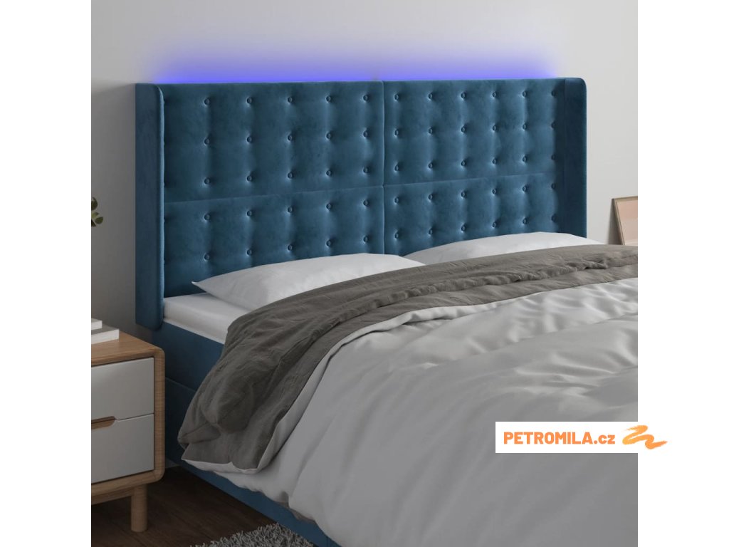 Čelo postele s LED tmavě modré 183 x 16 x 118/128 cm samet