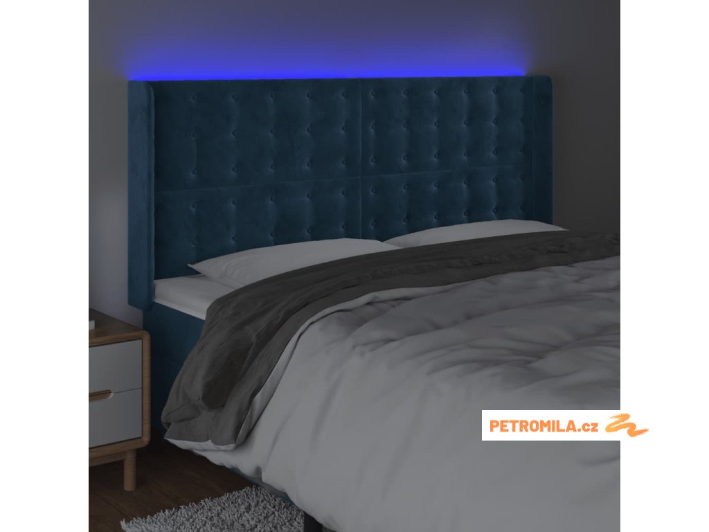 Čelo postele s LED tmavě modré 203 x 16 x 118/128 cm samet