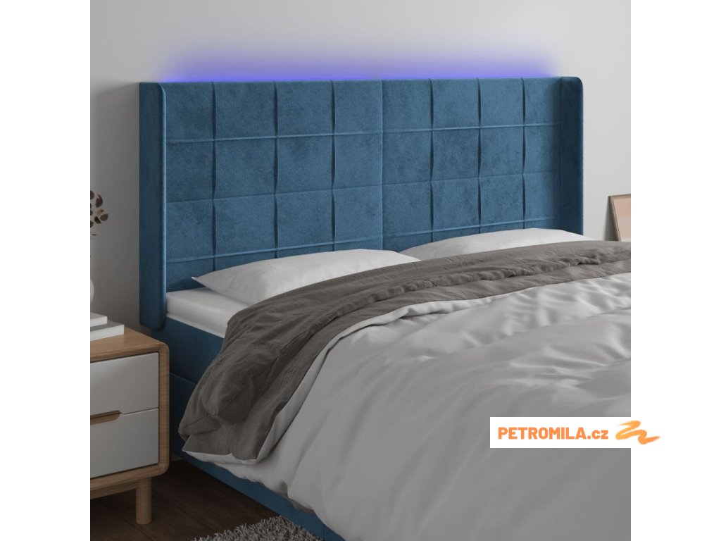 Čelo postele s LED tmavě modré 203 x 16 x 118/128 cm samet