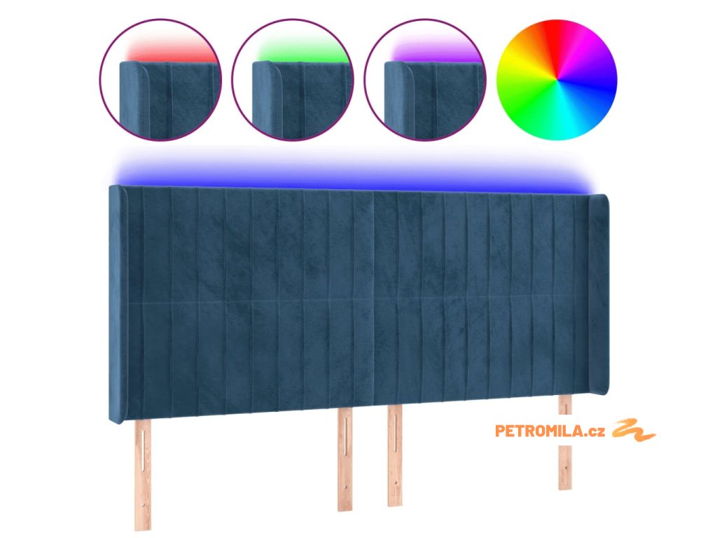 Čelo postele s LED tmavě modré 203 x 16 x 118/128 cm samet