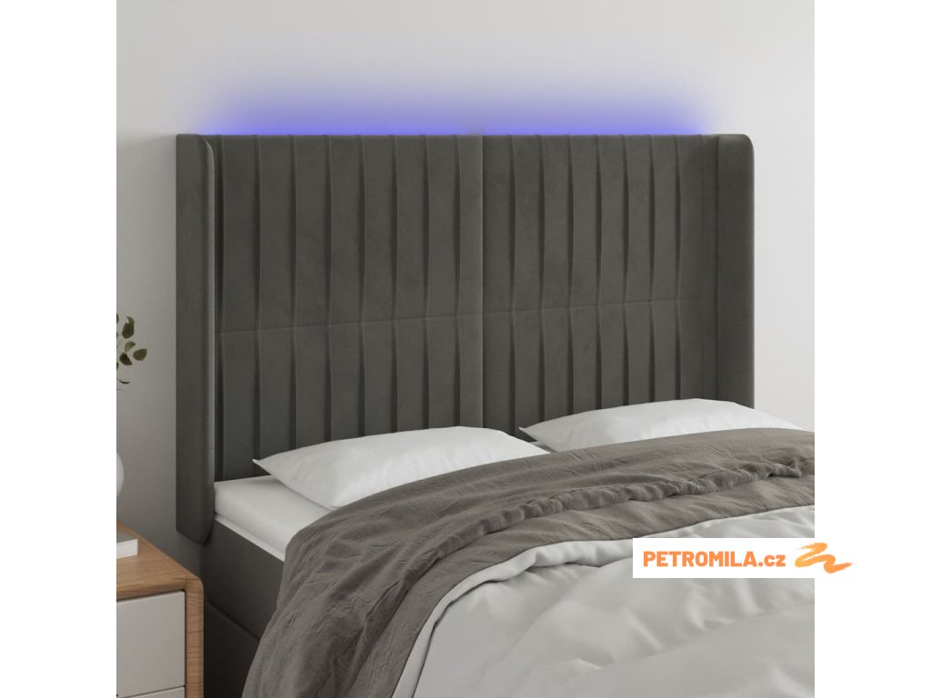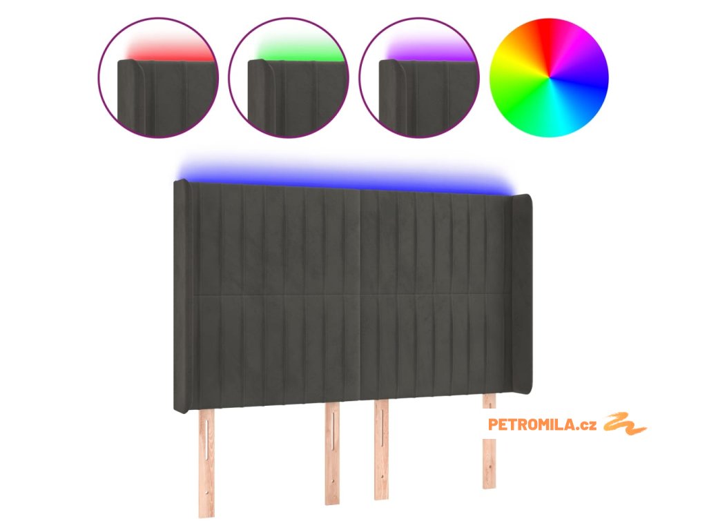 Čelo postele s LED tmavě šedé 147 x 16 x 118/128 cm samet
