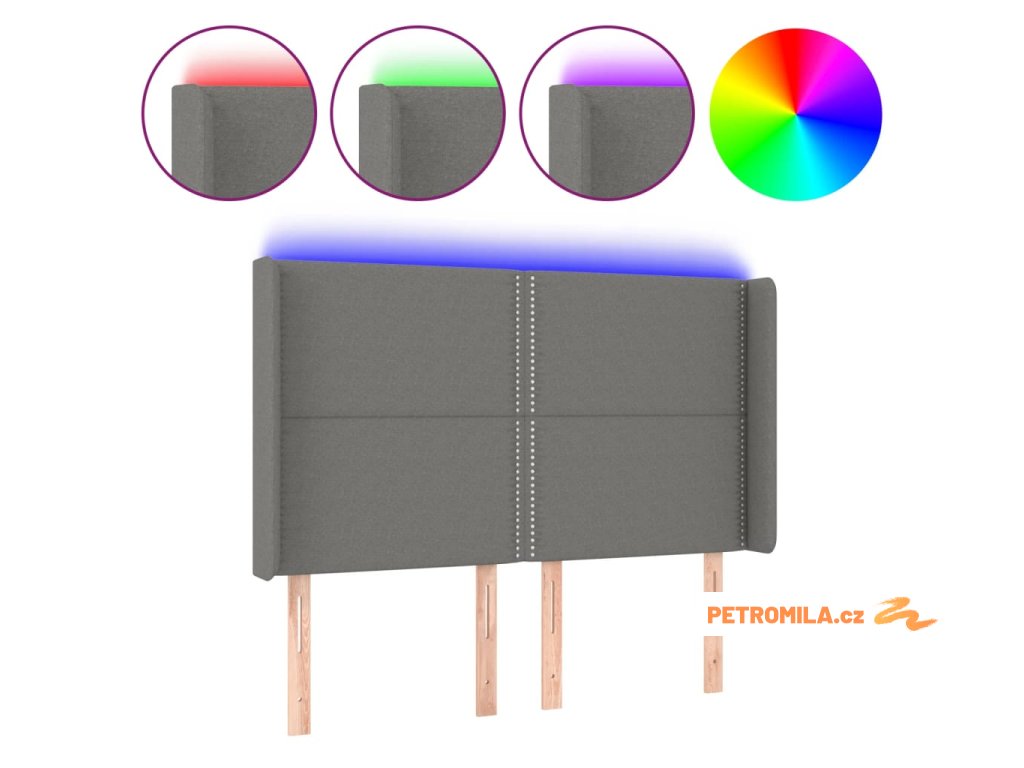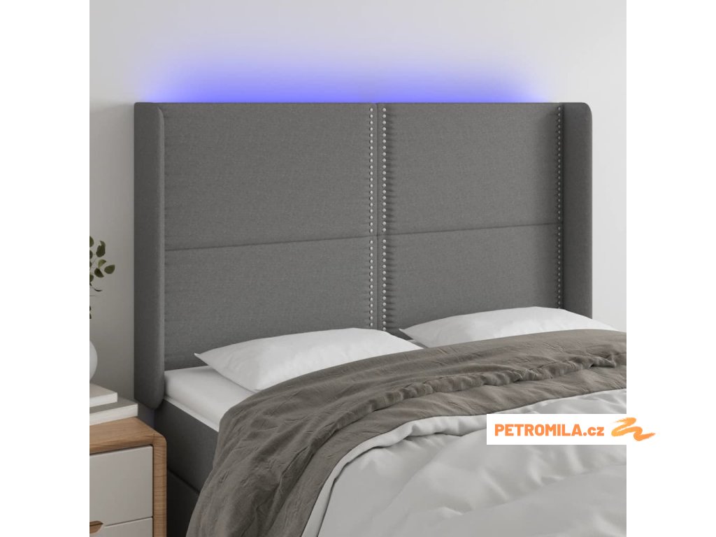 Čelo postele s LED tmavě šedé 147 x 16 x 118/128 cm textil