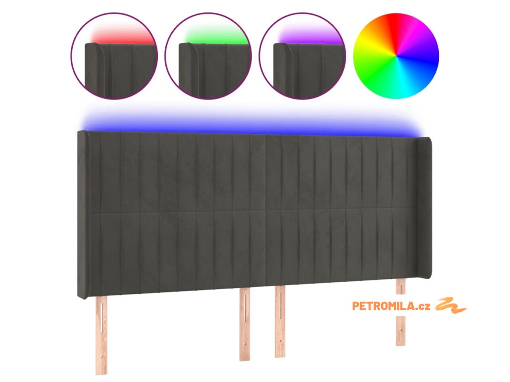 Čelo postele s LED tmavě šedé 163 x 16 x 118/128 cm samet