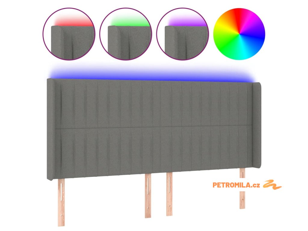 Čelo postele s LED tmavě šedé 163 x 16 x 118/128 cm textil