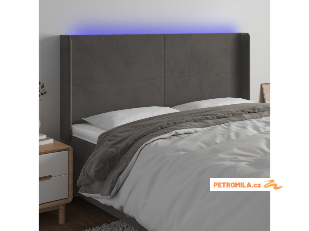 Čelo postele s LED tmavě šedé 203 x 16 x 118/128 cm samet