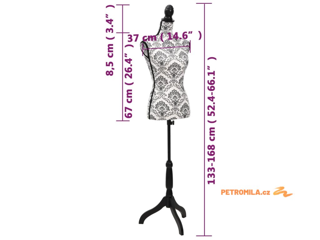 Výšku této aranžérské panny lze nastavovat od 133 do 168 cm. Rozsah nastavení vám umožní adaptovat figurínu vašim specifickým potřebám. Torzo panny je zhotovené ze 100% polyesteru a lze do něj volně zapichovat špendlíky.